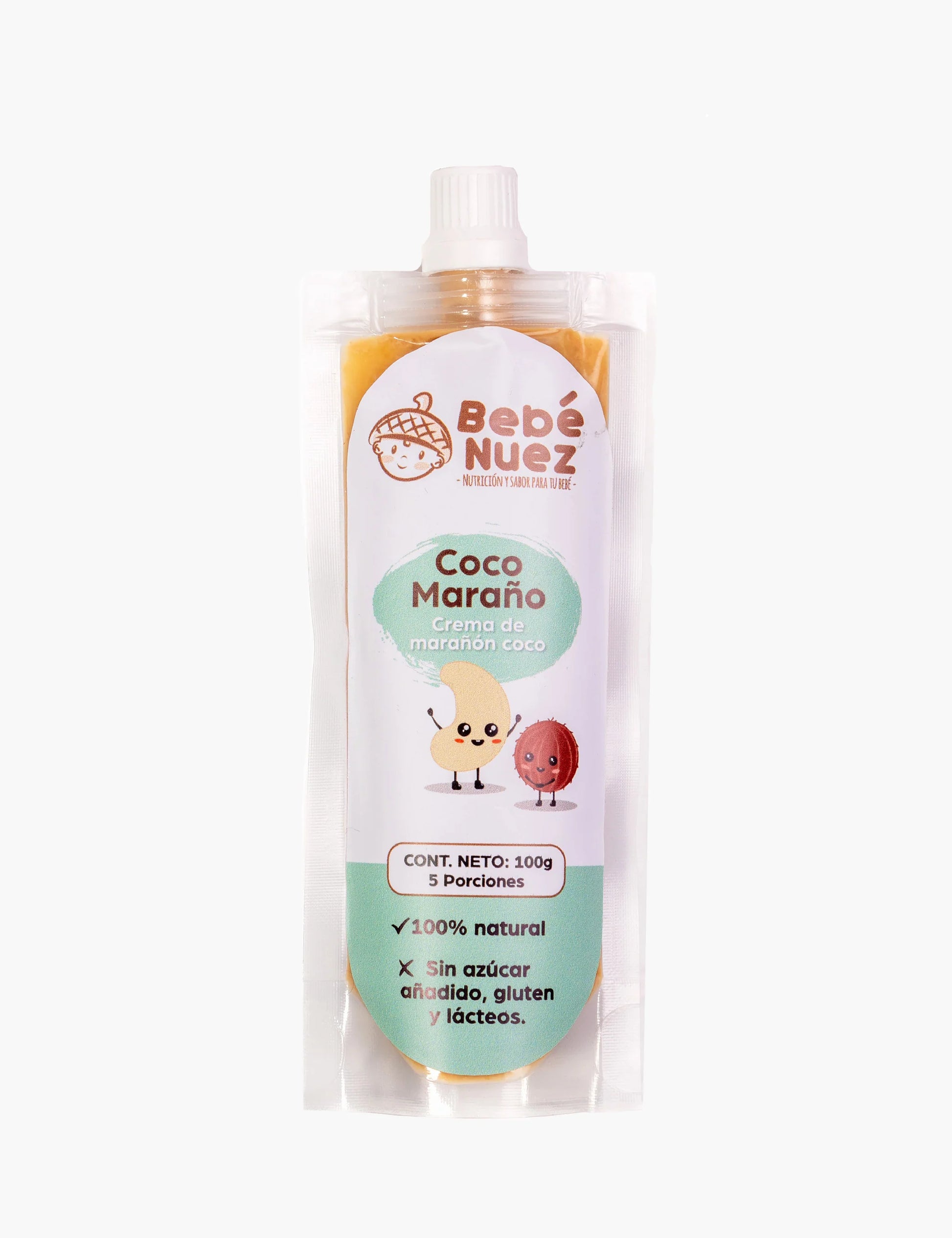 Marañón tostado y coco deshidratado en una mezcla suave, sin azúcar, sin sal y sin conservantes. Ideal para bebés desde los 6 meses.