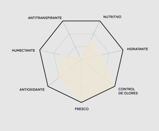 Las sustancias activas naturales como agua de salvado de arroz (Oryza sativa bran water), agua de naranja (Citrus aurantium dulcis fruit water) y bicarbonato de sodio tienen un efecto desodorizante, ayudando a prevenir la formación de olores. La combinación de óxido de zinc y extracto de nuez de castilla (Hydrolyzed walnut extract), aporta frescor duradero. La manteca de karité (Butyrospermum parkii butter) y los aceites de avena (Avena sativa kernel extract), sésamo (Sesamum indicum seed oil) y semilla de granada (Punica granatum seed oil) cuidan la sensible piel axilar, aportándole nutrientes de alto valor.