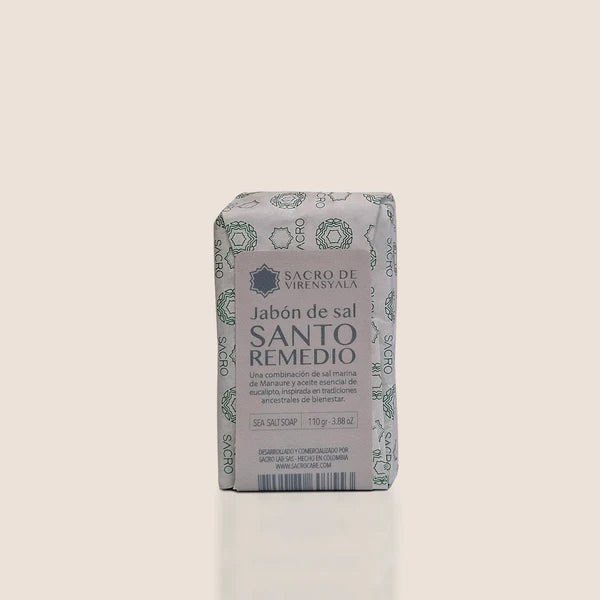 Nuestro Jabón Santo Remedio combina la sal marina de Manaure, reconocida por su calidad y por la belleza natural de las salinas y el aceite esencial de eucalipto procesado artesanalmente en la sabana de Bogotá.